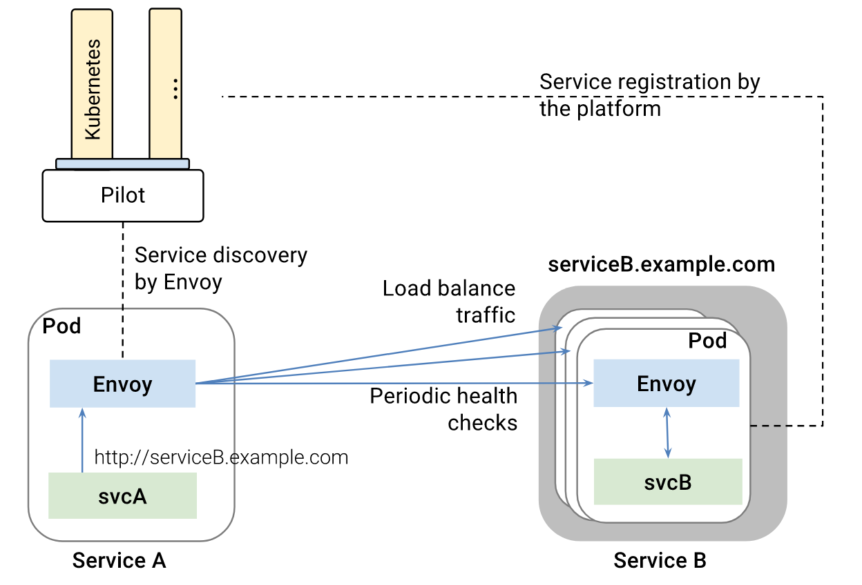 - 流量管理的核心组件是 Pilot,负责管理和配置服务网格中的所有 Envoy 实例
