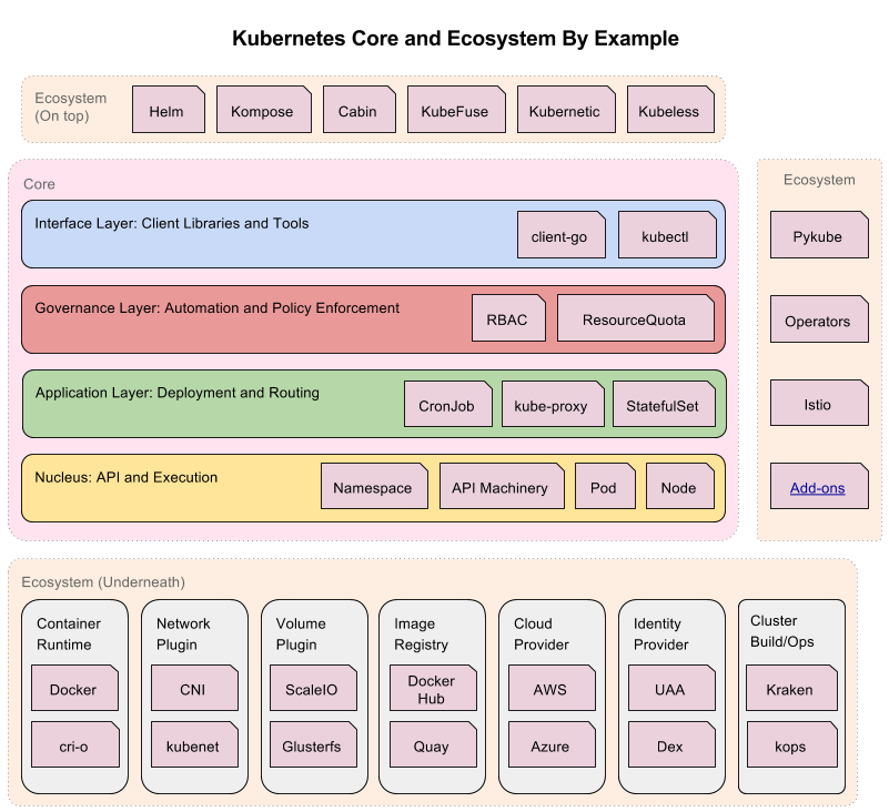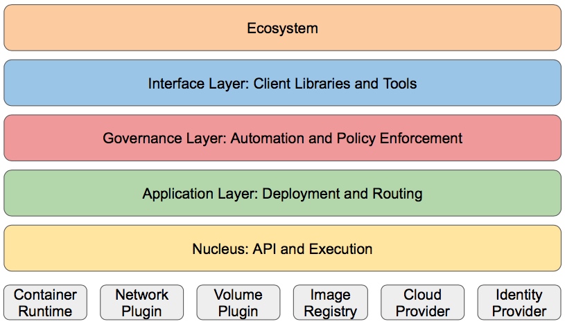 - 管理层:系统度量(如基础设施、容器和网络的度量),自动化(如自动扩展、动态 Provision 等)以及策略管理(RBAC、Quota、PSP、NetworkPolicy 等)