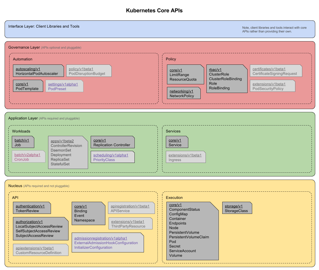 - 核心层:Kubernetes 最核心的功能,对外提供 API 构建高层的应用,对内提供插件式应用执行环境